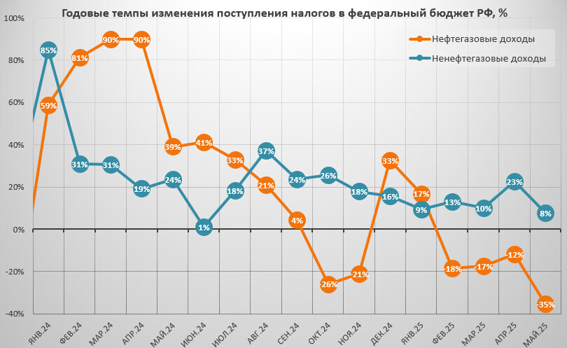 Резюме. Доходи бюджету впали нижче торішнього травня на 6%. Уперше за 1,5 року, доходи впали нижче попереднього періоду. Причиною стало падіння нафтогазових доходів на (-35%) і зниження темпу зростання ненафтогазових доходів до скромних (+8%), незважаючи на інфляцію у 10%.