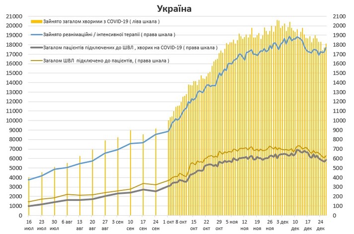 Вот правда только больничная статистика портит общую картину перемоги. На 27 декабря на стационарах находилось 18114 пациентов с диагнозом Ковид, из них в реанимациях 1768, подключено к аппаратам ШВЛ – 584.