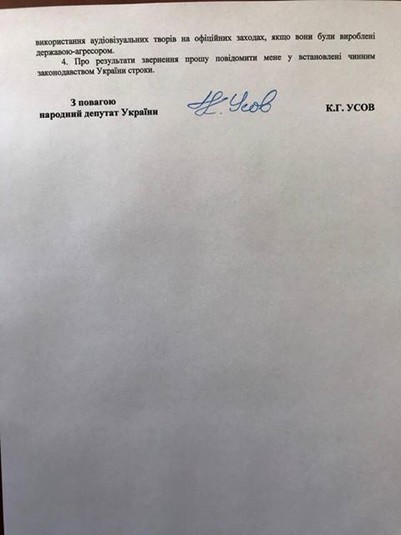 При цьому, як юрист припускаю, що, незважаючи на очевидну невідповідність інтересам нашої національної безпеки та оборони, даний інцидент не порушує чинне законодавство. На цей випадок я готовий спільно зі Службою безпеки України розробити і внести до парламенту законопроект, який заборонить використання на офіційних заходах всіх рівнів аудіо-візуальних і текстових творів, які були створені пропагандистською машиною Кремля, або будь-якою іншою країною, визнаною у встановлений законом спосіб державою-агресором.
