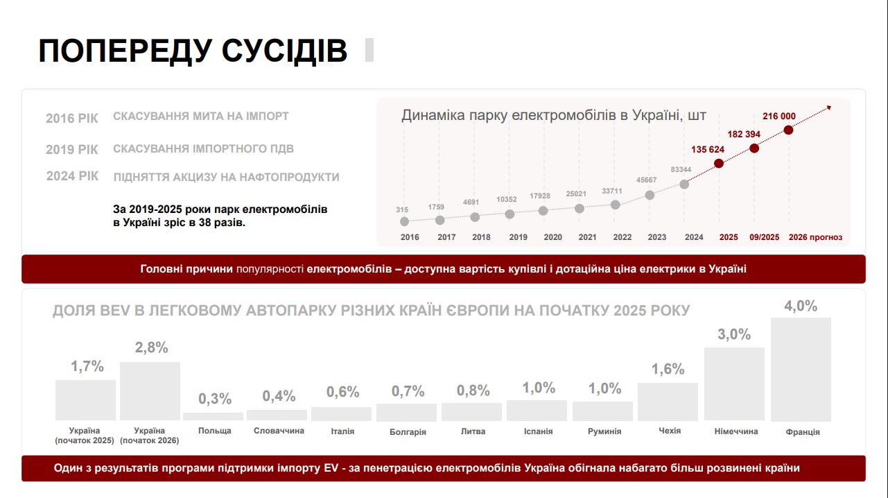 В цьому контексті не можна не вказати і на проблеми. Як це часто буває, разом з податками на пальне зростає і дірка, через яку ці бюджетні гроші витікають. Кількість електромобілів у 2025 році збільшилась майже вдвічі і наразі оцінюється у 225 000 одиниць. Податків рух цієї купи електрокарів фактично не передбачає. Як не передбачає й мит, внеску у Пенсійний фонд та акцизу. Це справжній офшор. Пільги у бідній Україні настільки безпрецедентні, що за часткою електрокарів в загальному парку ми вже випередили більшість країн Європи!