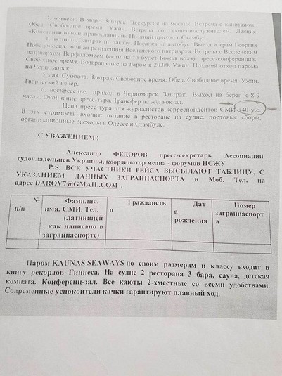 Сразу три журналистки (Мария Шевчук, Наталья Смирнова и Лариса Ерошкина) с того самого парома объявили, что они ехали на конференцию по судоходству. И ни малейшего представления не имели о визите к святейшему. Я могу продолжить битву, оперируя анкетами группы, аккредитовывавшейся именно на пресс-тур в Константинополь, и снова разглашая персональные данные, но юристы советуют этого не делать. При этом не исключаю, что часть людей просто пытались использовать, а части все равно куда ехать и как оформляться журналистом или паломником.