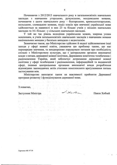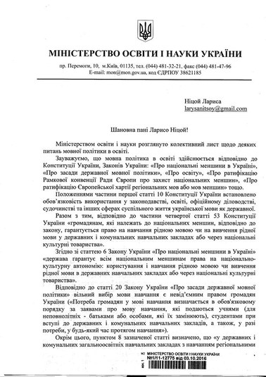 Так от, надійшла відповідь! На 6 аркушів (шість!). І знаєте, що там? Там на 5 аркушах з 6 витяги з законів України, на яких посилається Міністерство освіти, чому воно розвивало і розвиватиме мови меншин і не опікується українською.