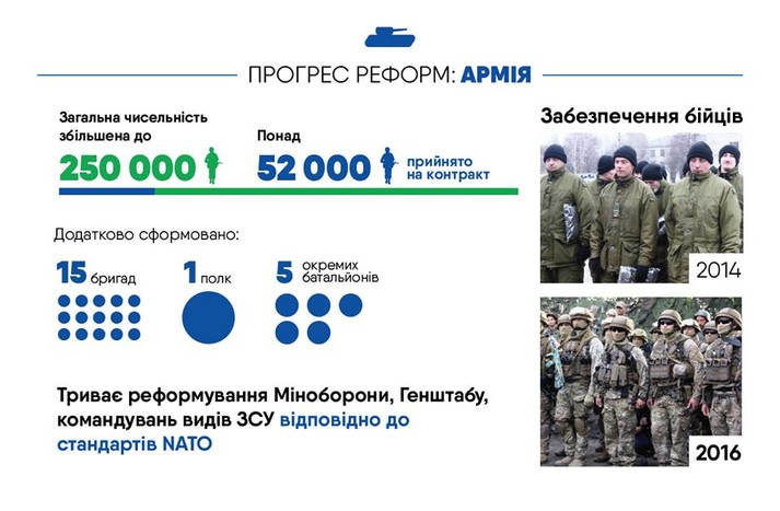 - Армія: боєздатність і ефективність тепер на якісно іншому рівні, система постачання військ відповідає стандартам НАТО.