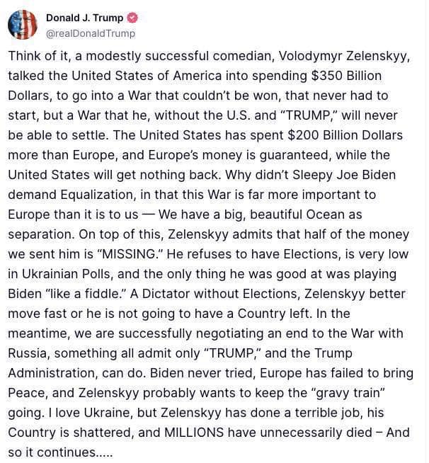 «Подумайте тільки: скромно успішний комік Володимир Зеленський переконав Сполучені Штати Америки витратити 350 мільярдів доларів на війну, яку не можна було виграти, яка ніколи не мала розпочатися, але яку він без США і Трампа ніколи не зможе врегулювати. США витратили на 200 мільярдів доларів більше, ніж Європа, до того ж європейські гроші гарантовані, а США не отримають нічого натомість. Чому ж сонний Джо Байден не зажадав вирівнювання, адже ця війна набагато важливіша для Європи, ніж для нас - у нас є великий, красивий океан, який нас відділяє. Крім того, Зеленський визнає, що половина грошей, які ми йому відправили, «ПРОПАЛА».