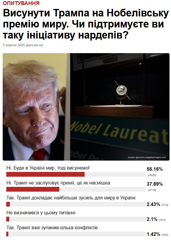 Спитав вчора президента Зеленського: чи треба Трампа виписувати на Нобеля, якщо війні кінця-краю не видно? Бо народ, як показує опитування «Главкома», радить не спішити.