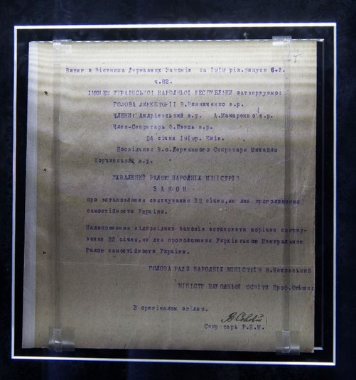 «Однині воєдино зливаються століттями одірвані одна від одної частини єдиної України – Західно-Українська Народна Республіка… і Наддніпрянська Велика Україна. Здійснилися віковічні мрії, якими жили і за які вмирали кращі сини України.