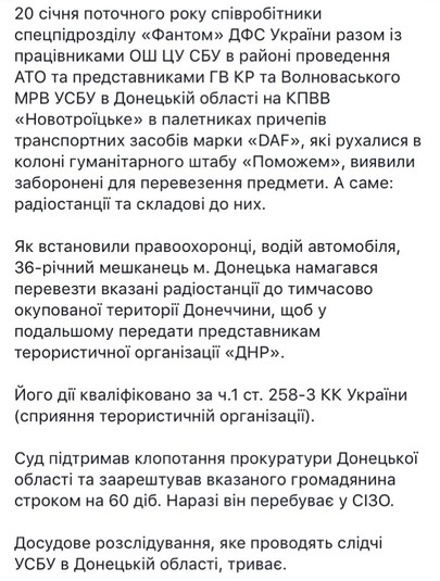 Прокуратура Донецької області / суд закрили в СІЗО 36-річного мешканця Донецька. Водія фури. І встановили попередньо, що рації він віз сепарам. Фури продовжують їздити в Донецьк.