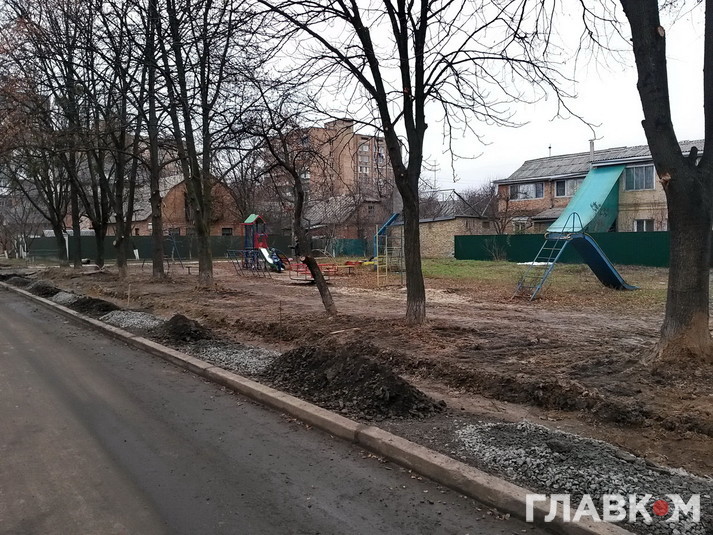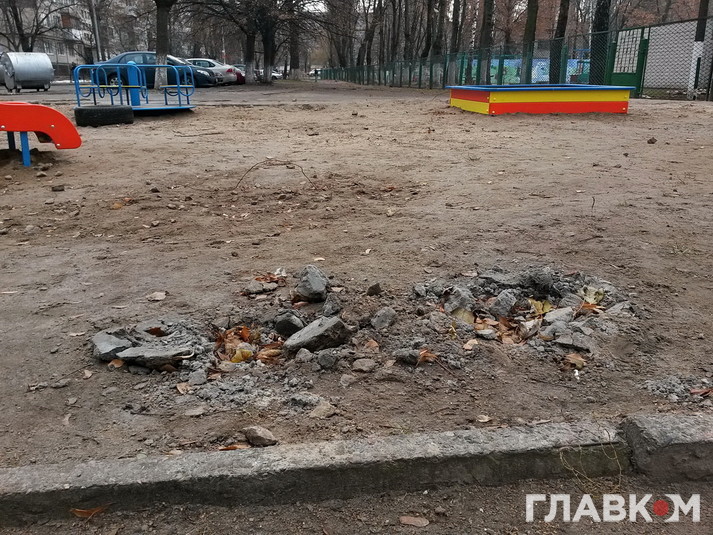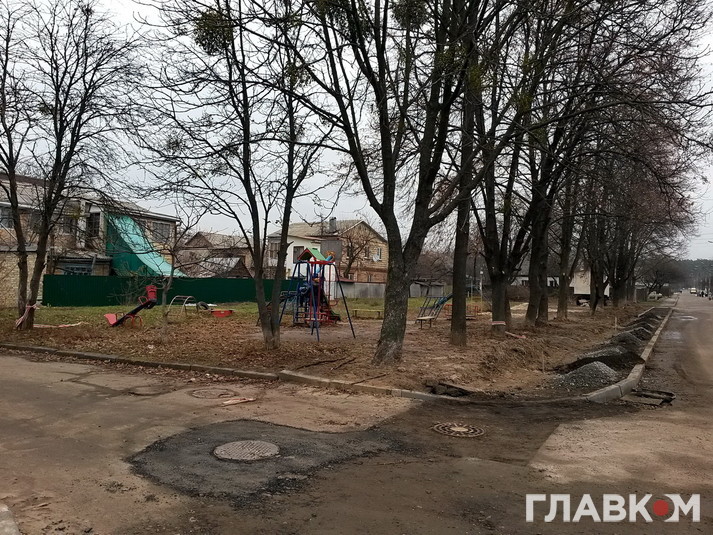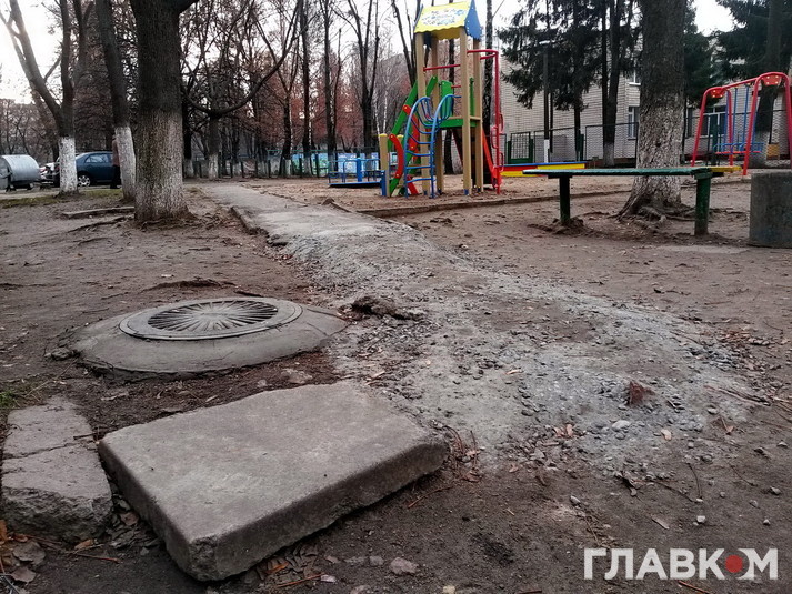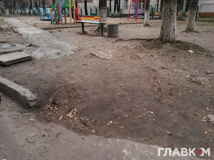 Територію не облаштовано, біля гойдалок і каруселей – цегла та щебінь. Аби потрапити на майданчик, треба йти по вологій землі, бо доріжки не зроблено. Піску в пісочниці також нема.