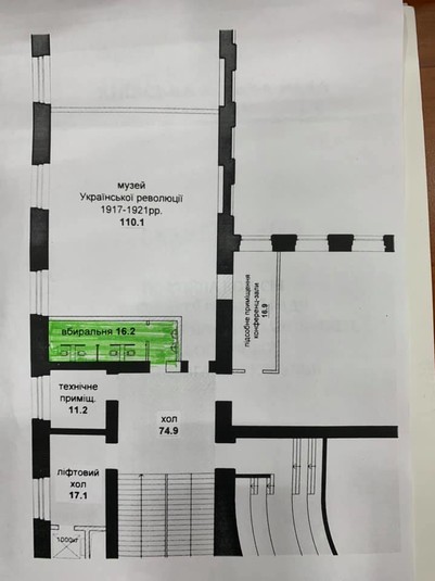 На малюнку номер один виділено місце, де знаходиться меморіальний кабінет Грушевського, на малюнку номер два туалет після реконструкції...