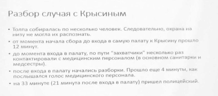 Це був захід з навчання протидіяти активістам, який Борис Тодуров організував для працівників інституту. В якості кейсу для навчання обрали ситуацію, яка вже відбувалася — переховування у дитячому відділенні Крисіна. Тоді активістам вдалося потрапити до нього в палату. Тож на тренінгу обговорювали записи з камер спостереження, мабуть, щоби врахувати “помилки” персоналу.