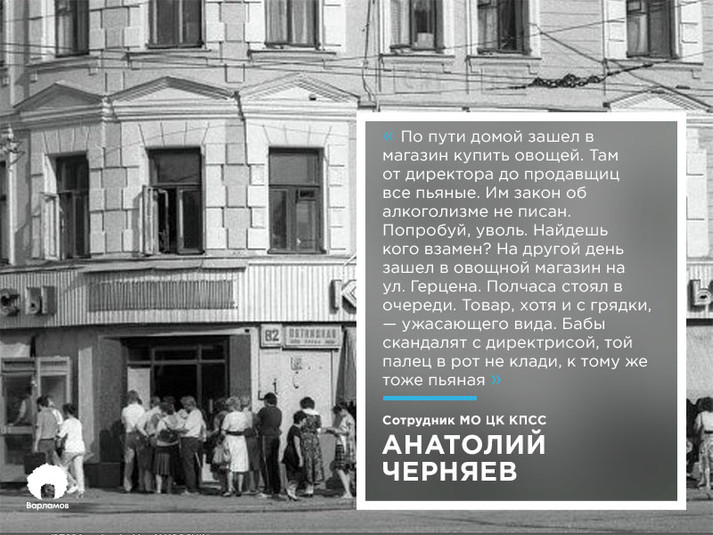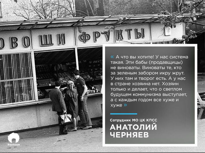 — А что вы хотите! У нас система такая. Эти бабы (продавщицы) не виноваты. Виноваты те, кто за зеленым забором икру жрут. У них там и творог есть. А у нас в стране хозяина нет. Хозяин только и делает, что о светлом будущем коммунизма выступает, а с каждым годом все хуже и хуже. Так и будет, пока хозяина настоящего нет. И т. д.