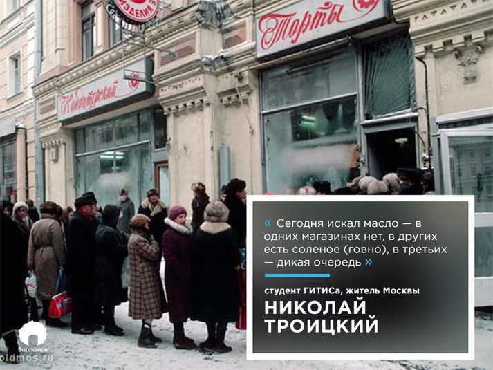В 1980-е работающие жители СССР в среднем тратили четверть свободного времени на посещение магазинов и очереди. Ожидание в очередях было важнейшей частью жизни. Но даже если советский гражданин имел в запасе деньги на товары, которые изредка и всегда внезапно появлялись на полках магазинов, даже если он был готов отстоять невероятно длинную очередь, ему далеко не всякий раз удавалось купить необходимое.