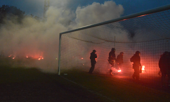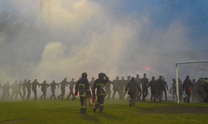 Не отямилися. Коли пропустили після грубої помилки перший гол, пролунали жорсткіші вибухи, а на перерву «Завжди вірні» проводили рідну команду скандуванням «Вам п...да». Спроби прорватися на поле тоді ще були поодинокими і легко перевдягненими в стюардів правоохоронцями локалізовані. «Ї...ш його» - люто закричав, скручуючи відчайдуху втрьох, один із поліціянтів. На щастя, цього разу бідолаху били не так сильно, як то було згодом. Коли львів'яни повернулися на поле, їх ще раз гучно попередили: «Ми вам цього не пробачимо». І запустили височенну сигнальну ракетницю, яка перелетіла весь стадіон.
