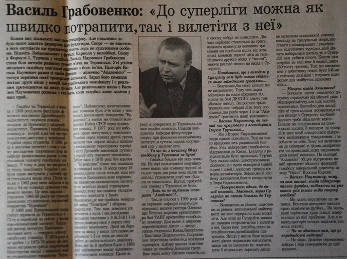 Нижче перефоткав своє інтерв'ю з Василем Наумовичем, датоване 27 березня 2002-го. З нього видно, що з іменем Грабовенка історія тернопільського гандболу переплетена з кінця 50-х років минулого сторіччя і майже до останніх днів, бо головним тренером суперлігової команди «Економ-Енерго» він залишався до 2017 року.