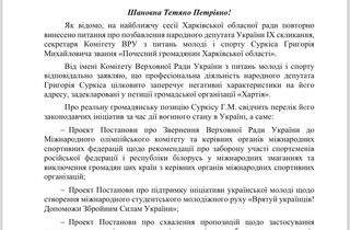 Йде страшна війна, харківська обласна рада має розглянути на найближчій сесії питання про позбавлення народного депутата Опозиційної платформи за життя Григорія Суркіса статусу «почесний громадянин області» на вимогу організації «Хартія», на базі якої створена 13-та бригада Нацгвардії «Хартія».