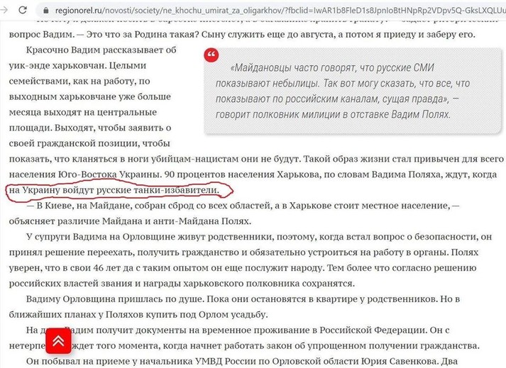 Вчера в одном из российских блогов, который ведут в интересах российских спецслужб сотрудники Центра анализа стратегий и технологий о ситуации в Украине, было выложено интервью с Вадимом Поляхом - беженцем из Украины российскому изданию «Орёл-регион», которое судя по дате было опубликовано по дате 7 мая 2014 года. Интервью является полностью украинофобским, в русле российской пропаганды, там много выдающихся цитат, ожидание российских танков в Украине, рассказы про страшных нацистов и что 90 % в Харькове ждут Россию. Главное, что Полях заявляет, что получает вид на жительство в РФ, что собирается забрать в Россию семью, и получить работу в управлении МВД Орловской области РФ, и что он договаривался с начальником милиции области Савенковым: https://regionorel.ru/novosti/society/ne_khochu_umirat_za_oligarkhov/