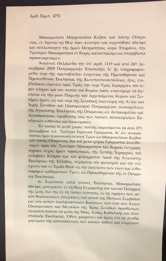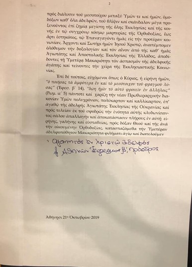 «Тож радіємо і ми добрій звістці про те, що спільні прагнення та дії увінчалися успіхом і зруйновано перепону, яка стояла посередині між Вами та нами, православними і братами у всьому, перепону, яка нас розділяла, завдаючи печалі, великих скандалів, та великої шкоди всій Церкві та спільному у сучасному світі свідченню Православ’я, перепону, яка донедавна стояла; і Його, Котрий повернув спілкування, яке колись існувало між нами, Владику і Спасителя нашого Ісуса Христа, прославляємо, Йому віддаємо всю належну шану та підносимо молитви всім серцем з нашої Святійшої Апостольської Елладської Церкви, посилаючи Вашому Блаженству цілунок братньої любові та простягаючи руку Церковного Спілкування.»