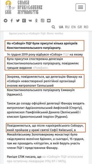 P.S. Як вишенька на торт - на сайті Ромфея, на який посилаються «пе-же», немає ані слова про присутність ієрархів Вселенського Патріархату на Архієрейському Соборі ПЦУ або про якусь «спостережну» функцію делегації. SOBOR, про який згадано в тексті - це Об‘єднавчий Собор 15.12.18 р. (з нагоди першої річниці Об‘єднавчого Собору (SOBOR).)