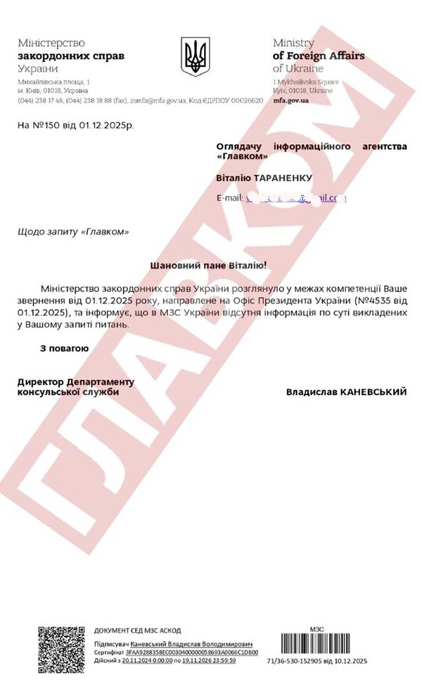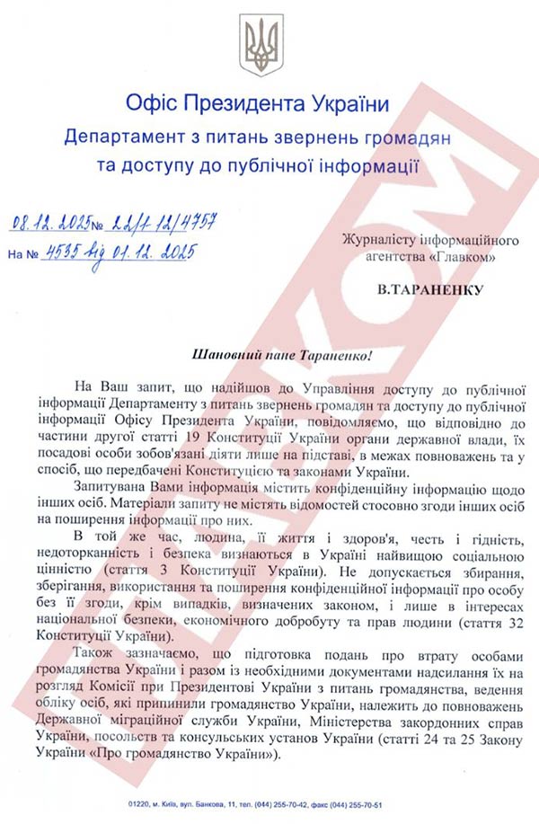 Водночас Офіс президента переадресував запит «Главкома» Міністерству закордонних справ та Державній міграційній службі. Зокрема, у МЗС повідомили, що не володіють запитуваною інформацією.