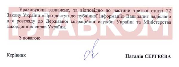 Натомість перша заступниця голови Державної міграційної служби Ірина Ковалевська відмовила у відповіді на запит «Главкома», посилаючись на неповне його оформлення.