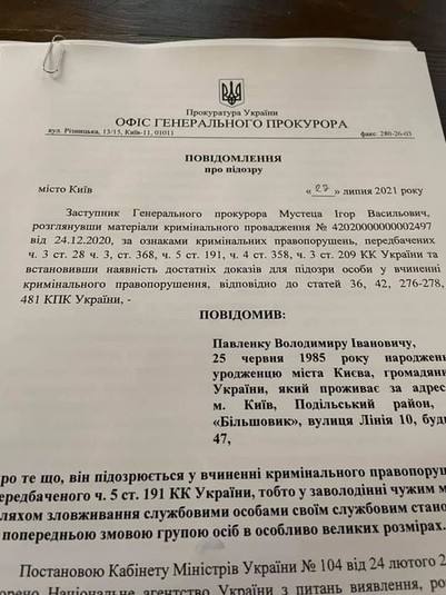 Підозри за ч. 5 ст. 191 ККУ (привласнення, розтрата вчинені в особливо великих розмірах або організованою групою) були вручені шістьом особам в рамках кримінального провадження № 42020000000002497 стосовно дій чиновників АРМА, яке ДБР почало розслідувати 24 грудня 2020 року. Дане провадження Офіс генерального прокурора об’єднав із іншою справою – № 62021000000000149 від 17.02.2021.