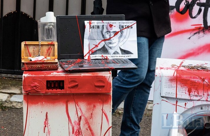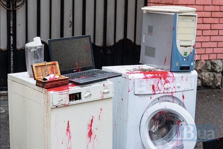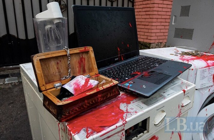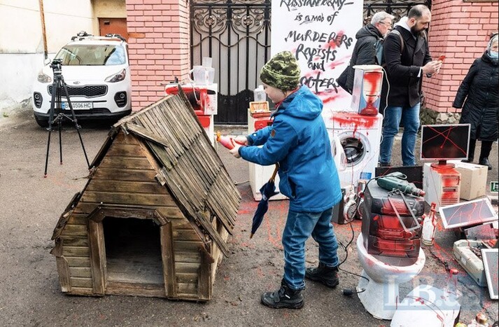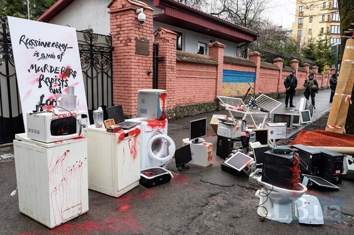 У Львові під російське консульство знесли речі, які найчастіше викрадають росіяни під час війни. Учасники акції облили червоною фарбою телевізори, самокати, гроші й особисті речі та залишили їх біля воріт консульства.