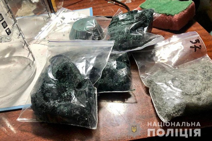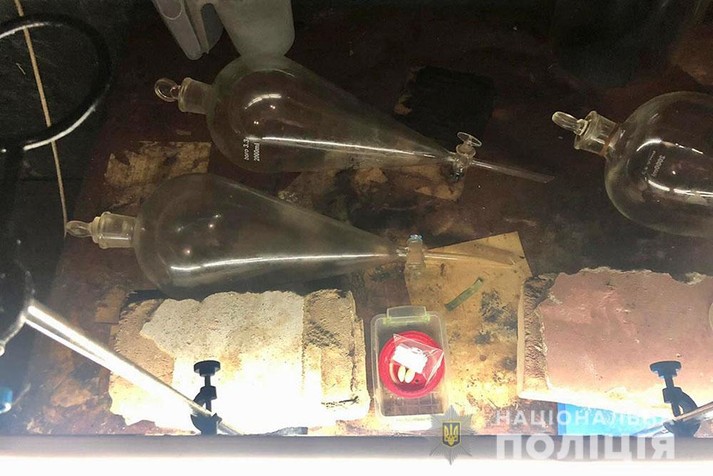 Поліцейські провели санкціонований обшук за місцем виготовлення психотропів. У результаті вилучено ємкості з PVP, 50 каністр з різними хімічними реактивами, зіп-пакети для фасування, електронні ваги та лабораторне обладнання.