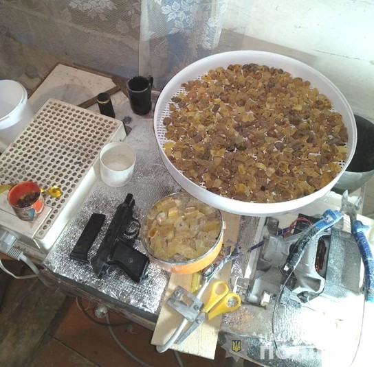 Правоохоронці виявили та вилучили орієнтовно 350 кг обробленого та необробленого бурштину, один станок для обробки каміння, автомобіль Volkswagen Transporter і стартовий пістолет.