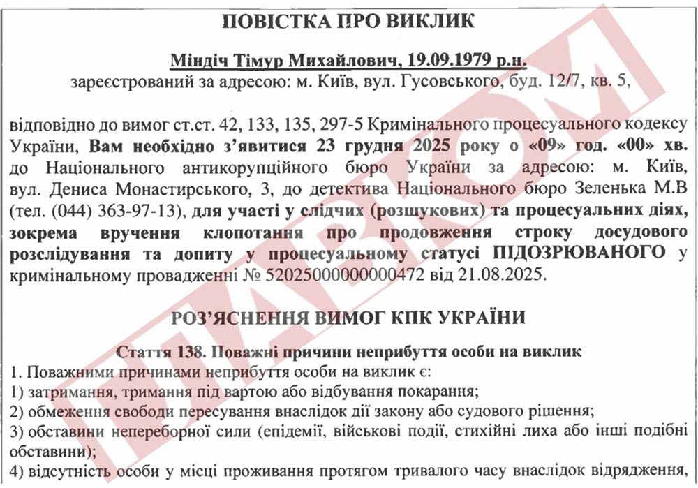 Нагадаємо, що НАБУ раніше викликало Міндіча та Цукермана на 26 і 28 листопада до будівлі НАБУ (вул. Дениса Монастирського, 3) для проведення допитів.