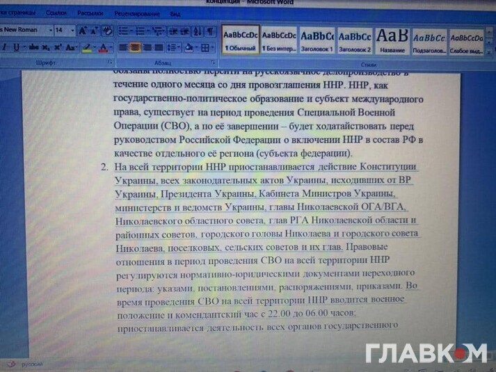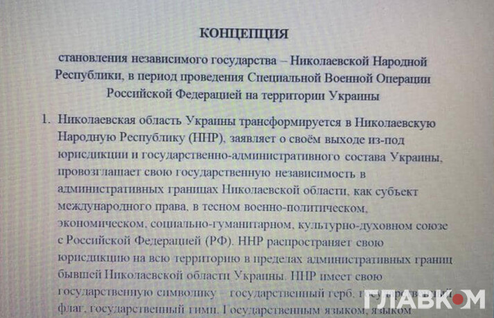 Згідно з копіями документів, які потрапили у розпорядження «Главкома», Миколаївська область мала самостійно проголосити «незалежність» і вийти зі складу України. Паралельно у «молодої республіки» вже були готові атрибути «державності»: герб, гімн і прапор. Проте «незалежність» не була фінальною метою зрадника.