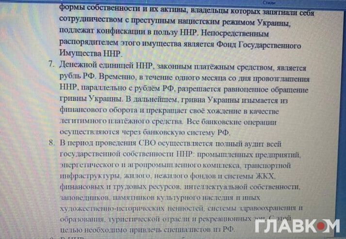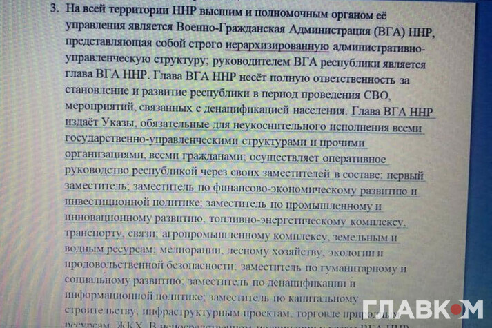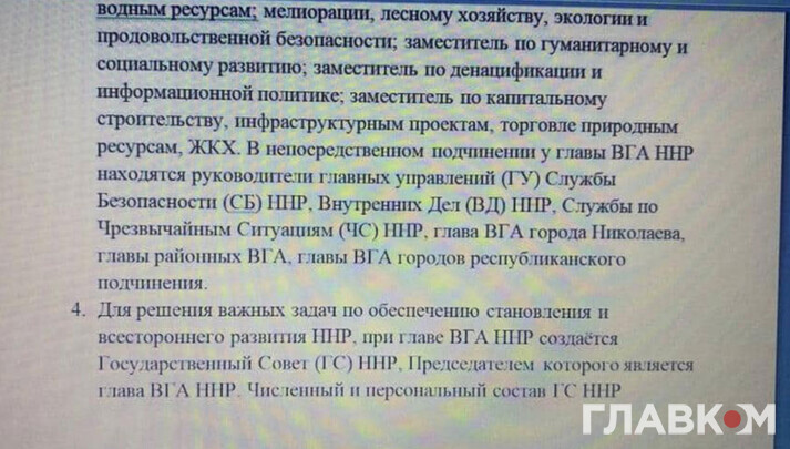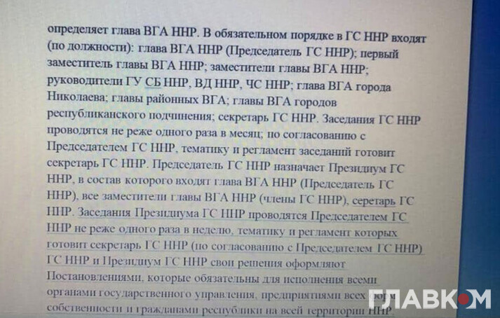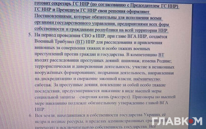 Окремо при керівнику військово-цивільної адміністрації запускається «державна рада» (для вирішення завдань із розвитку «МНР») і військовий трибунал, який мав розслідувати важкі злочини, серед яких шпіонаж, зрада Батьківщині (яке поняття сюди вкладається, незрозуміло – «Главком»), терористична і диверсійна діяльність. У принципі, саме такий підхід і були використано у сусідній Херсонський області, яка опинилась під окупацією. А це наводить на думку, що агенти впливу тісно співпрацювали з центром і саме звідти отримували плани «проголошення незалежності».