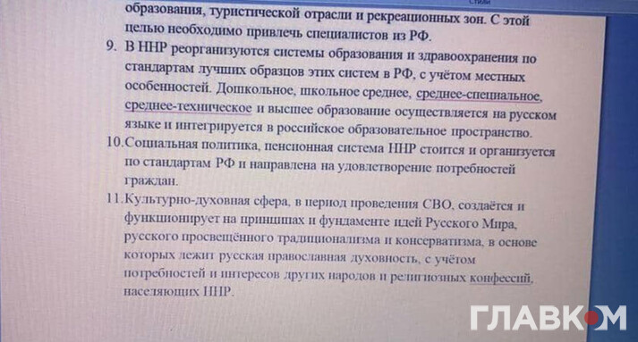 І, нарешті, головне – культурна і духовна сфера мали функціонувати на принципах і фундаменті «руского міра», «в основі якого лежить російська православна духовність із врахуванням потреб та інтересів інших народів і релігійних конфесій, які населяють «МНР».