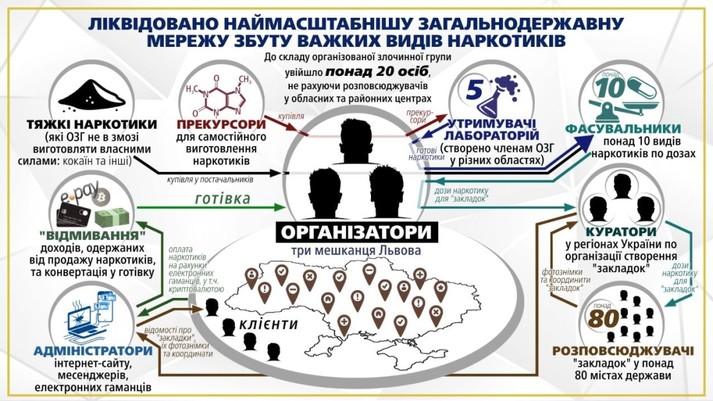 Регіональні «філії» збуту наркотиків були на Київщині, Миколаївщині, Харківщині, Львівщині та Дніпропетровщині