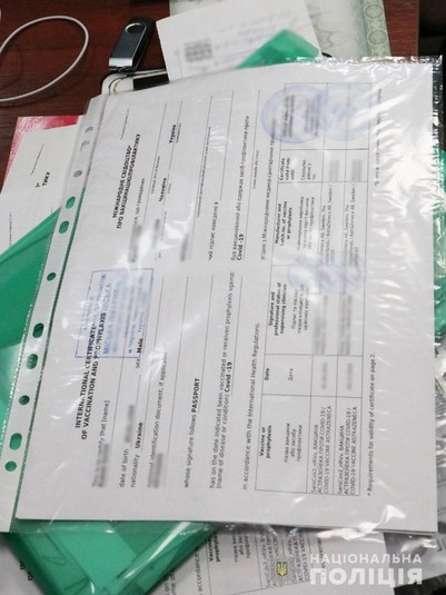 Там вилучено комп’ютери, печатки, копії документів та медичних декларацій, банківські картки, мобільні телефони та оформлені Covid-сертифікати.