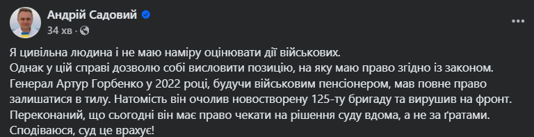 «Генерал Артур Горбенко у 2022 році, будучи військовим пенсіонером, мав повне право залишатися в тилу. Натомість він очолив новостворену 125-ту бригаду та вирушив на фронт. Переконаний, що сьогодні він має право чекати на рішення суду вдома, а не за ґратами. Сподіваюся, суд це врахує!» – каже він.