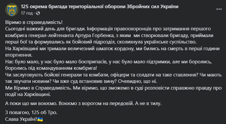 Бійці 125-ї окремої бригади Територіальної оборони ЗСУ відреагували на затримання їхнього колишнього командира Артура Горбенка. Його підозрюють у невдалій обороні Харківської області під час наступу росіян у 2024 році.
