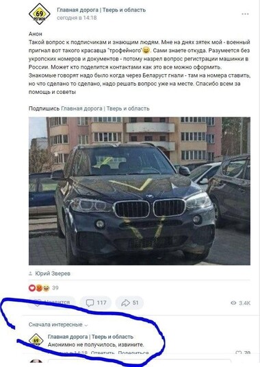 Один з мешканців Твері, що назвався Антоном, (насправді Юрій Звєрєв) звернувся до членів місцевої групи за допомогою «зареєструвати» позашляховик BMW в Росії.