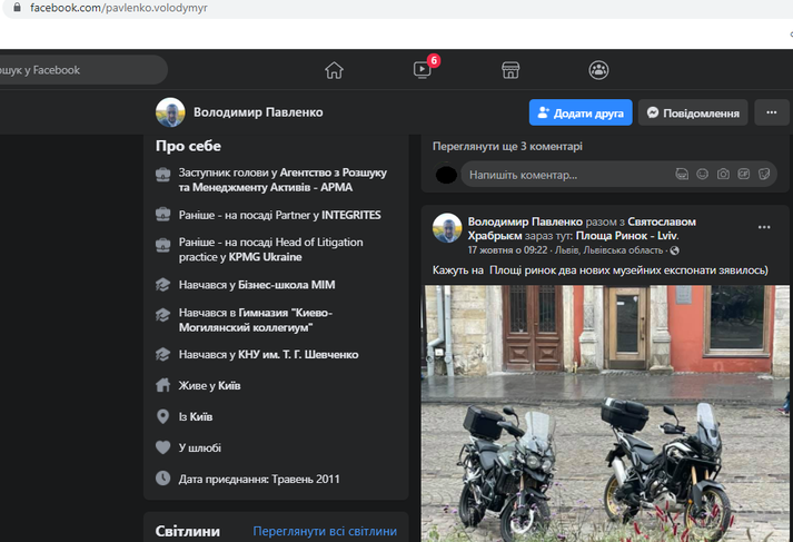 16 жовтня о 13:54 Павленко опублікував своє фото з Івано-Франківської області, у селі Верховина (це 622 км від Києва).