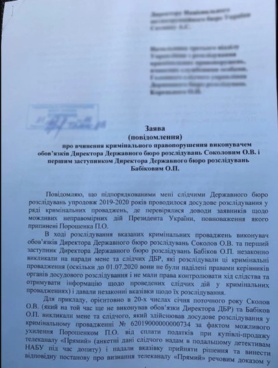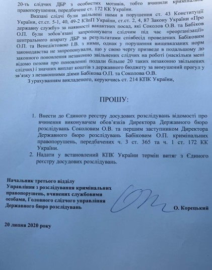 Начальник третього відділу управління з розслідування кримінальних правопорушень ДБР Олег Корецький написав заяву до Директора НАБУ Артема Ситника про вчинення кримінального правопорушення керівниками ДБР Соколовим і Бабіковим.