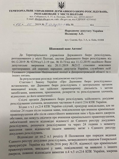 Вигнаний із фракції «Слуги народу» нардеп Антон Поляков опублікував відповідь Держбюро розслідувань на свою заяву щодо народного депутата від «СН» Юрія Корявченкова. Раніше Поляков «злив» у мережу аудіозапис з голосом, схожим на голос Корявченкова, який роздає вказівки керівництву поліції Кривого Рогу.