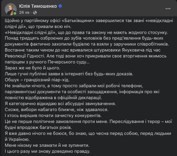 Лідерка партії «Батьківщина» Юлія Тимошенко відреагувала на обшуки у партійному офісі політичної сили та назвала його політичним тиском. Про це Тимошенко повідомила у дописі на своїй сторінці у соцмережах.
