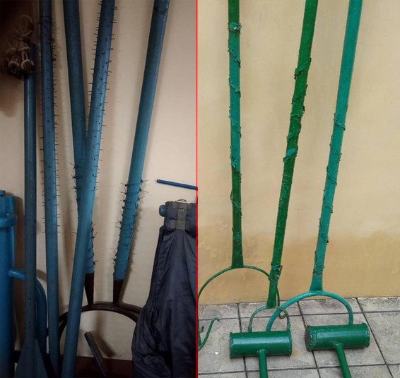 Прокуратура Полтавщини вилучила моторошні спецзасоби у кількох місцевих в’язницях – заціпи та рогачі, обмотані колючим дротом з гострими металевими шипами, ломи і кувалди, які могли застосувати для катування ув’язнених.