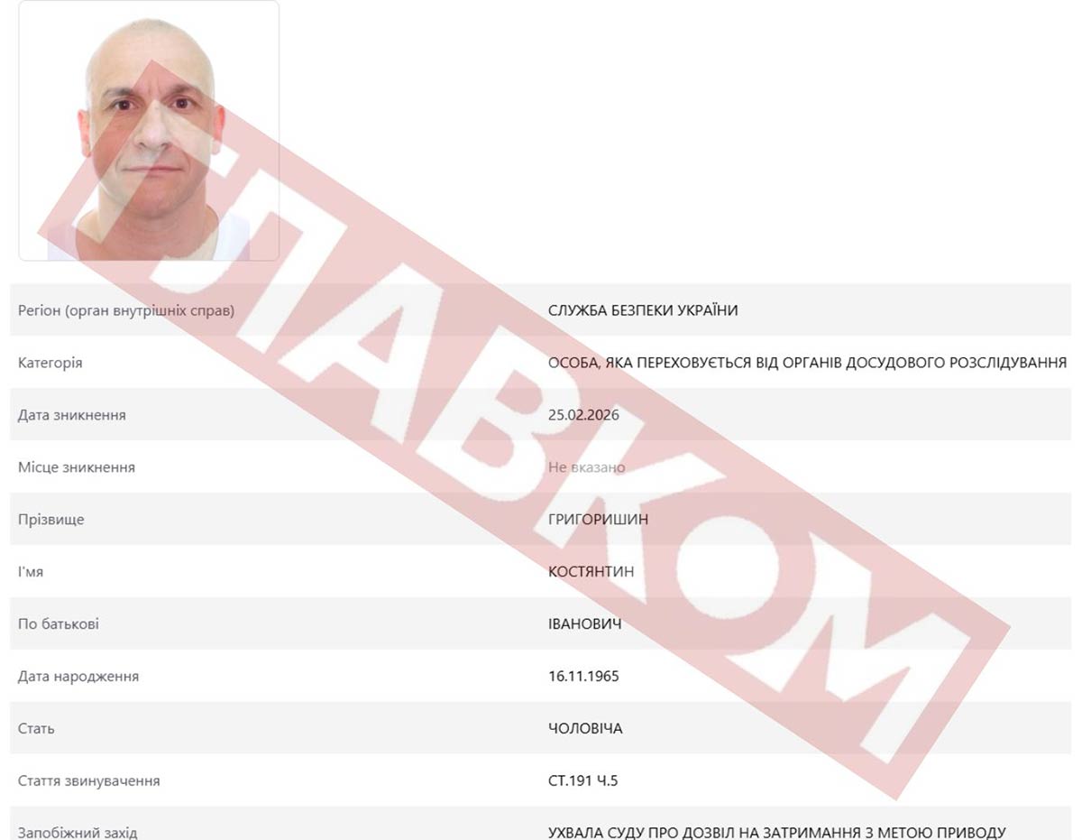 Підсанкційний бізнесмен Костянтин Григоришин потрапив до бази розшуку Міністерства внутрішніх справ. Як повідомляє «Главком», світлина Григоришина розміщена у розділі «Особа, яка переховується від органів досудового розслідування». Датою зникнення бізнесмена вказано 25 лютого 2026 року.
