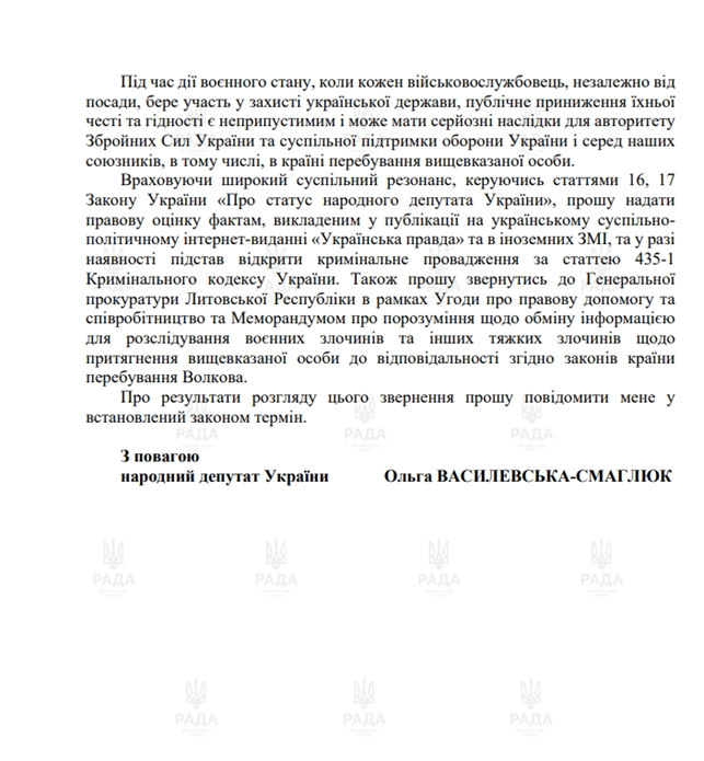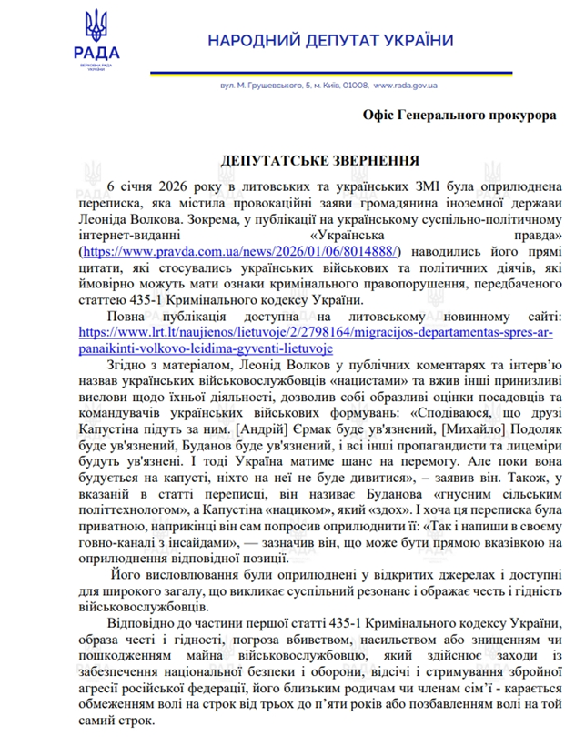 Наразі українські правоохоронці офіційно зареєстрували кримінальне провадження після депутатського звернення обраниці від «Слуги народу» Ольги Василевської-Смаглюк. Волкову «світить» відповідальність до восьми років тюрми за двома статтями: виправдовування агресії РФ (ч. 3 ст. 436-2 Кримінального кодексу); образа честі та гідності військових (ст. 435-1 Кримінального кодексу).