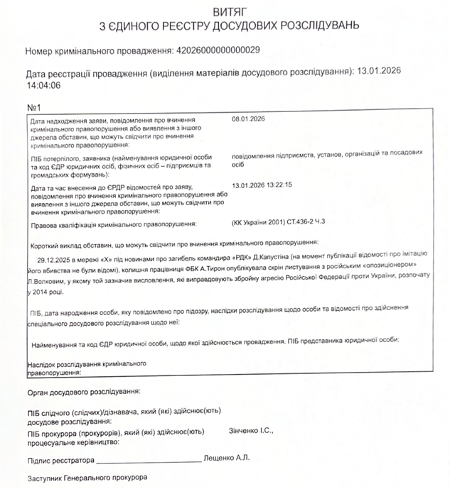 Україна відкрила кримінальну справу проти російського «опозиціонера» через образи ЗСУ та Буданова