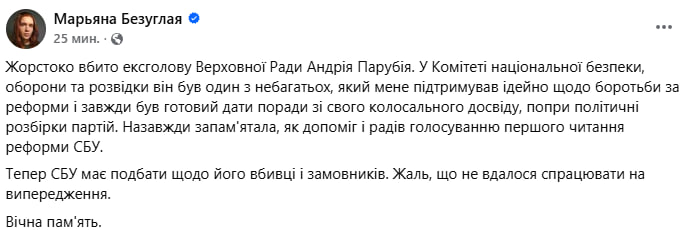 Народна депутатка Мар'яна Безугла пише, що СБУ має подбати щодо його вбивці і замовників.