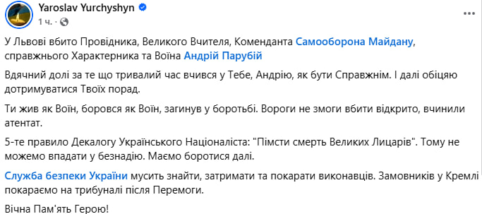 Народний депутат Ярослав Юрчишин також висловився про загибель Андрія Парубія.