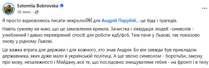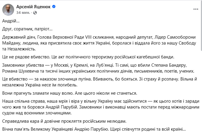 Народний депутат, а нині військовий Олег Ляшко написав: «У мене немає жодного сумніву, що вбивство Парубія, як і Фаріон, – це кривава робота російських спецслужб».
