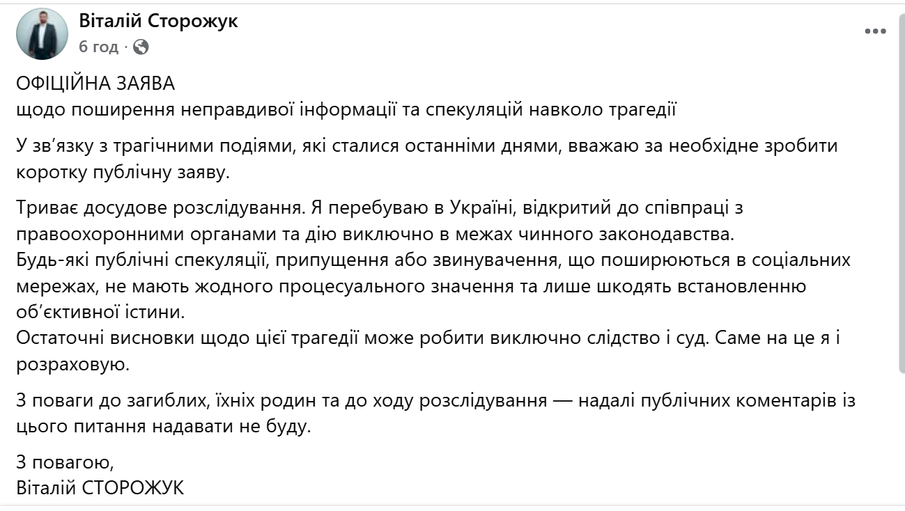«Триває досудове розслідування. Я перебуваю в Україні, відкритий до співпраці з правоохоронними органами та дію виключно в межах чинного законодавства. Будь-які публічні спекуляції, припущення або звинувачення, що поширюються в соціальних мережах, не мають жодного процесуального значення та лише шкодять встановленню об’єктивної істини. Остаточні висновки щодо цієї трагедії може робити виключно слідство і суд. Саме на це я і розраховую», – заявив він.