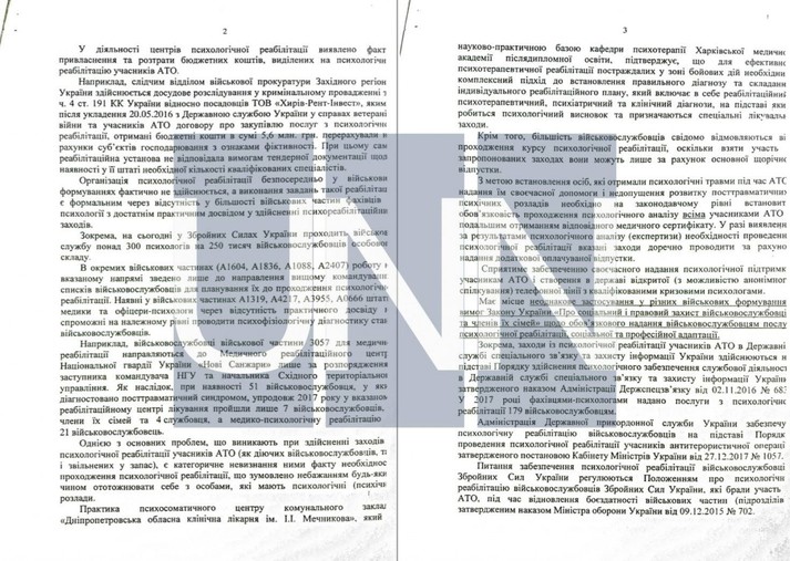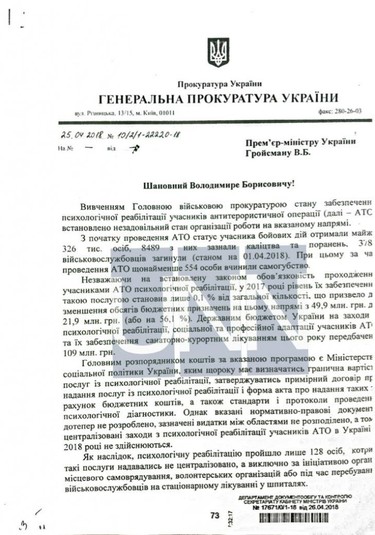 У листі від 25 квітня 2018 року Головний військовий прокурор описує ситуацію у системі проведення психологічної реабілітації учасників АТО.